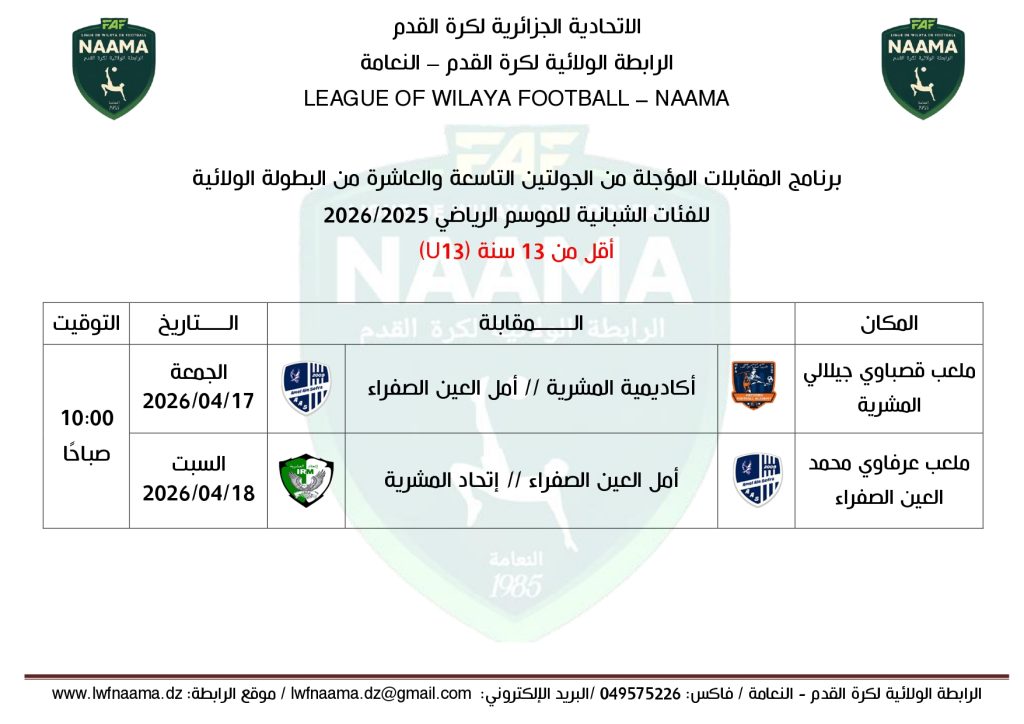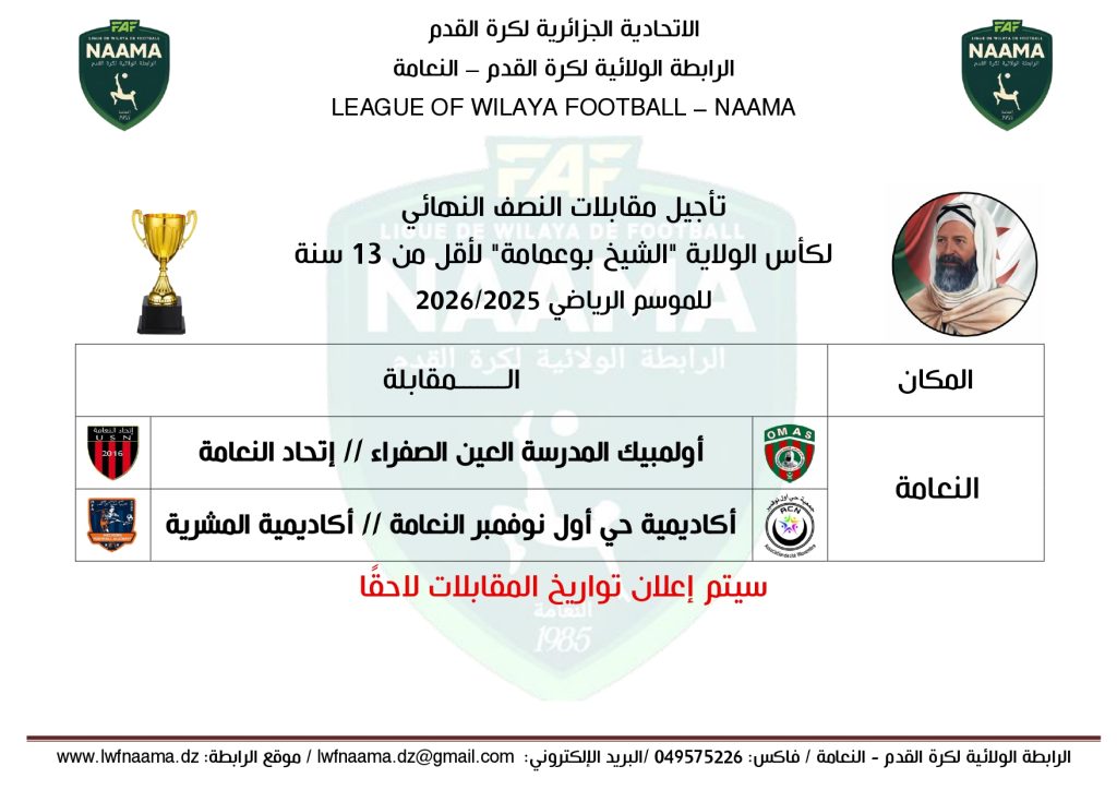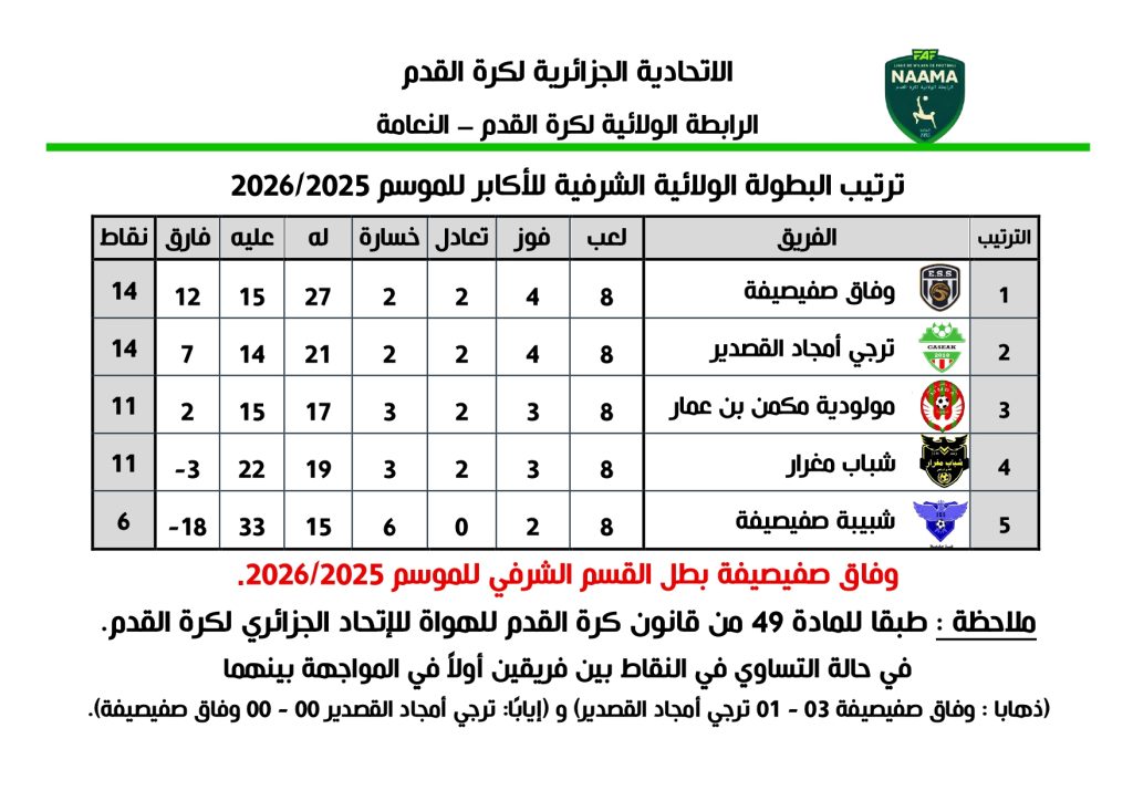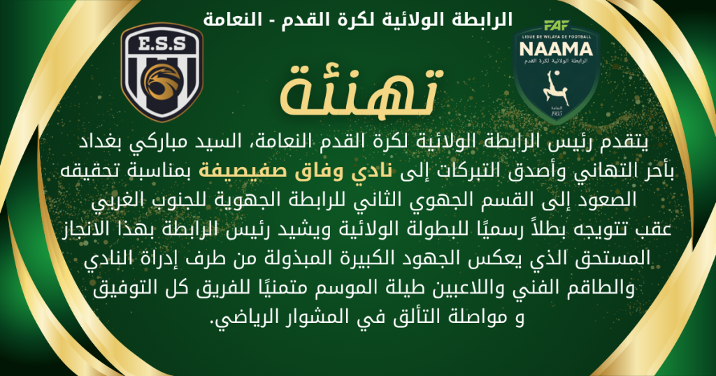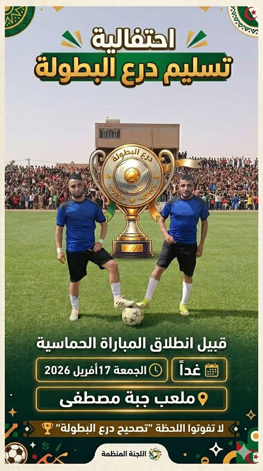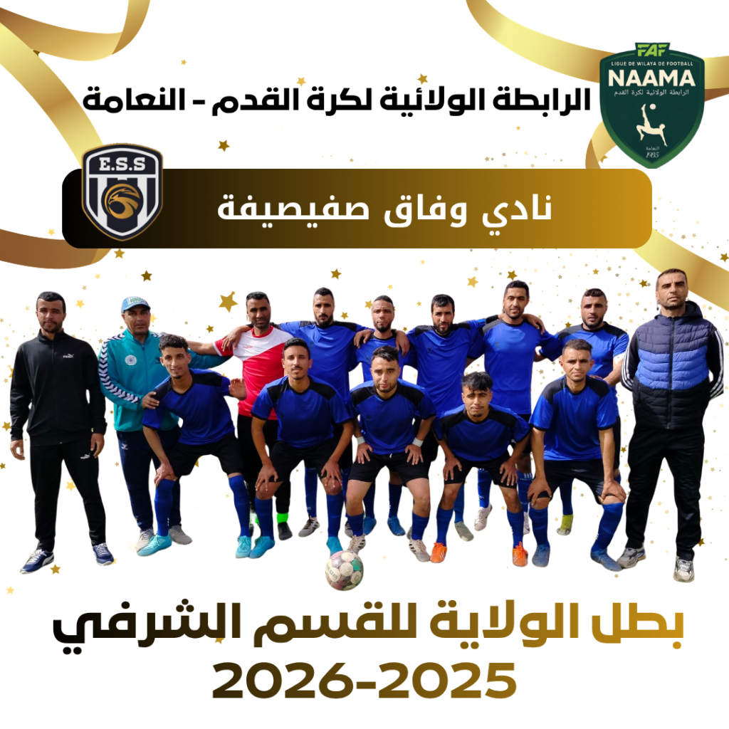 وفي أجواء استثنائية، ستشهد هذه المناسبة أيضًا مراسم تسليم درع البطولة لنادي وفاق صفيصيفة، الذي تُوّج بلقب القسم الشرفي الولائي للرابطة الولائية لكرة القدم النعامة لموسم 2025-2026، بعد مشوار ناجح أكد فيه الفريق أحقيته بالصدارة والتتويج.