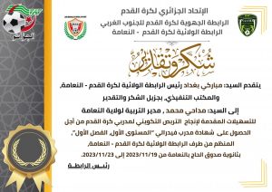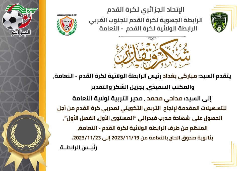 تم صباح اليوم الخميس تكريم السيد #مداحي_محمد مدير التربية لولاية النعامة، من طرف الرابطة الولائية لكرة القدم النعامة، ممثلتا بالسيد #بغداد_مباركي رئيس الرابطة وهذا للتسهيلات المقدمة ولمساهمته في انجاح التربص التكويني لمدربي كرة القدم فاف 1 (الفصل الأول) والذي أجري من 19 نوفمبر إلى 23 نوفمبر 2023 بثانوية صدوق الحاج بالنعامة.