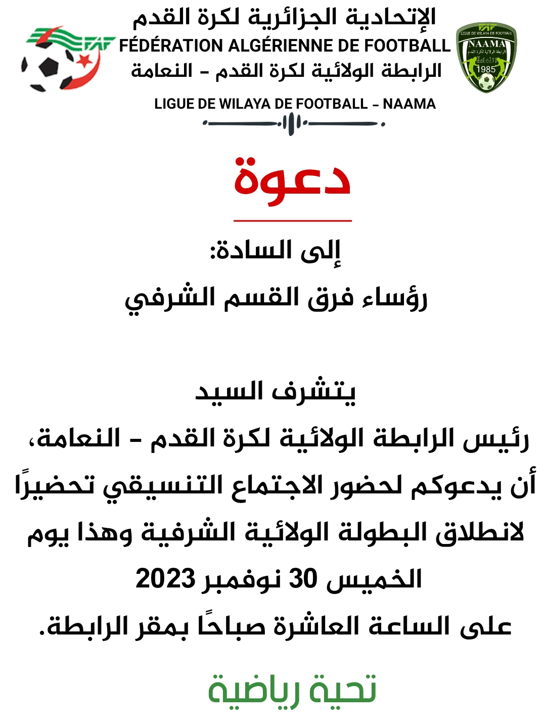 دعوة: إلى السادة رؤساء فرق القسم الشرفي الرئيسية 29 نوفمبر 202329 نوفمبر 2023 by admin دعوة إلى السادة رؤساء فرق القسم الشرفي يتشرف رئيس الرابطة الولائية لكرة القدم بالنعامة أن يدعوكم لحضور الاجتماع التنسيقي تحضيرا لانطلاق البطولة الشرفية وهذا يوم الخميس 30 نوفمبر 2023 على الساعة العاشرة صباحًا بمقر الرابطة تحية رياضية