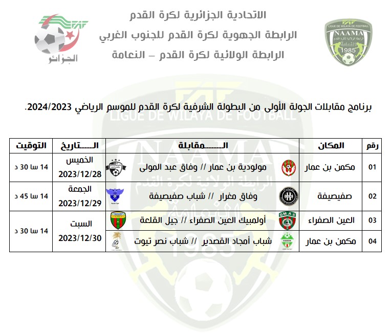 برنامج مقابلات الجولة الأولى من البطولة الشرفية للأكابر الأكابر الرئيسية 25 ديسمبر 20231 يناير 2024 by admin برنامج مقابلات الجولة الأولى من البطولة الشرفية لكرة القدم للموسم الرياضي 2024/2023.