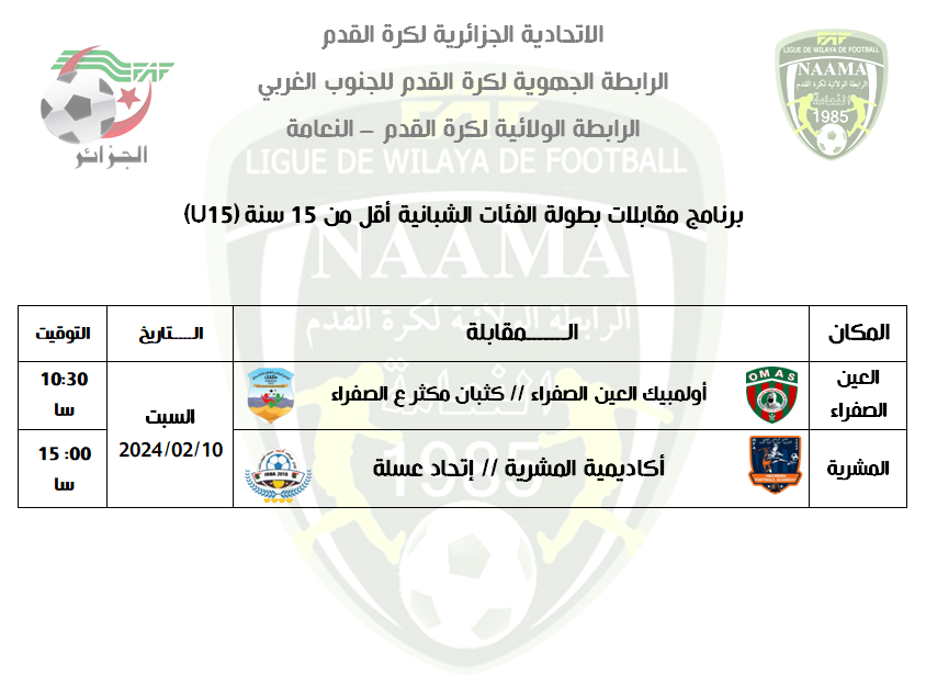 برنامج مقابلات بطولة الفئات الشبانية أقل من 15 سنة (U15) الرئيسية الشبانية 4 فبراير 20246 فبراير 2024 by admin برنامج مقابلات بطولة الفئات الشبانية أقل من 15 سنة (U15)