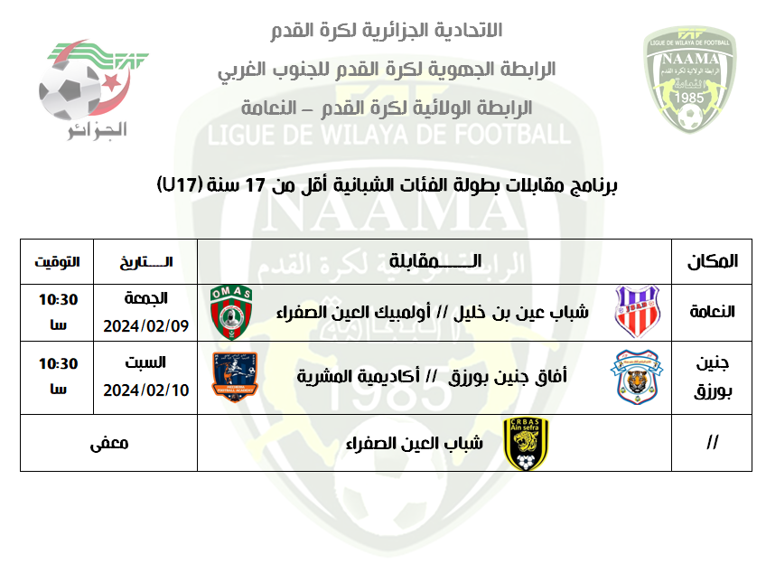 برنامج مقابلات بطولة الفئات الشبانية أقل من 17 سنة (U17) الرئيسية الشبانية 4 فبراير 20244 فبراير 2024 by admin برنامج مقابلات بطولة الفئات الشبانية أقل من 17 سنة (U17)