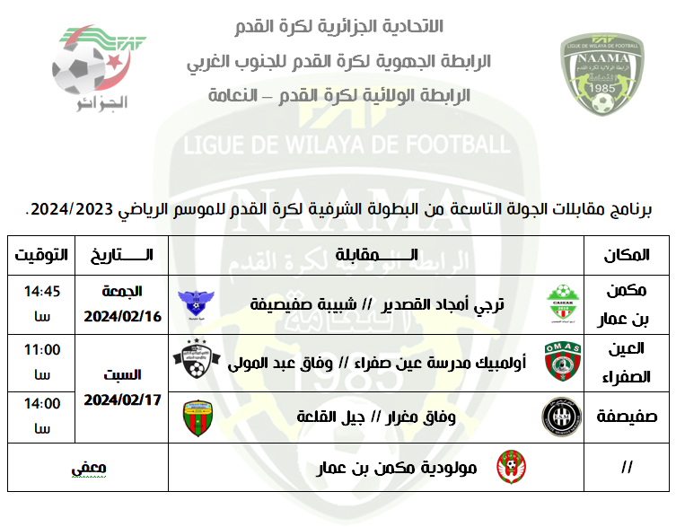 برنامج مقابلات الجولة التاسعة للبطولة الولائية الشرفية للأكابر الأكابر الرئيسية 13 فبراير 202413 فبراير 2024 by admin إليكم برنامج مقابلات الجولة التاسعة للبطولة الولائية الشرفية للأكابر للموسم الرياضي 2024/2023