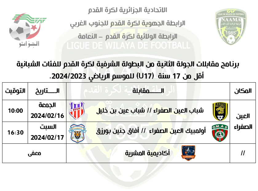 برنامج مقابلات الجولة الثانية لبطولة الفئات الشبانية أقل من 17 سنة (U17) البرامج الرئيسية الشبانية 13 فبراير 202423 فبراير 2024 by admin برنامج مقابلات الجولة الثانية من البطولة الشرفية لكرة القدم للفئات الشبانية أقل من 17 سنة (U17) للموسم الرياضي 2024/2023.