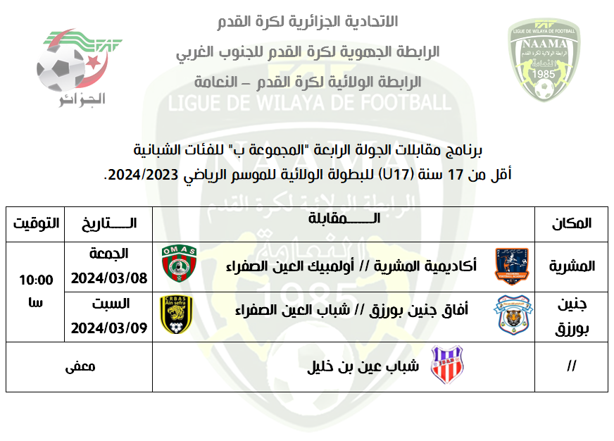 برنامج مقابلات بطولة الفئات الشبانية، الجولة الرابعة “المجموعة ب” البرامج الرئيسية الشبانية 4 مارس 2024 by admin إليكم برنامج مقابلات الجولة الرابعة “المجموعة ب” للفئات الشبانية أقل من 17 سنة (U17) للبطولة الولائية للموسم الرياضي 2024/2023