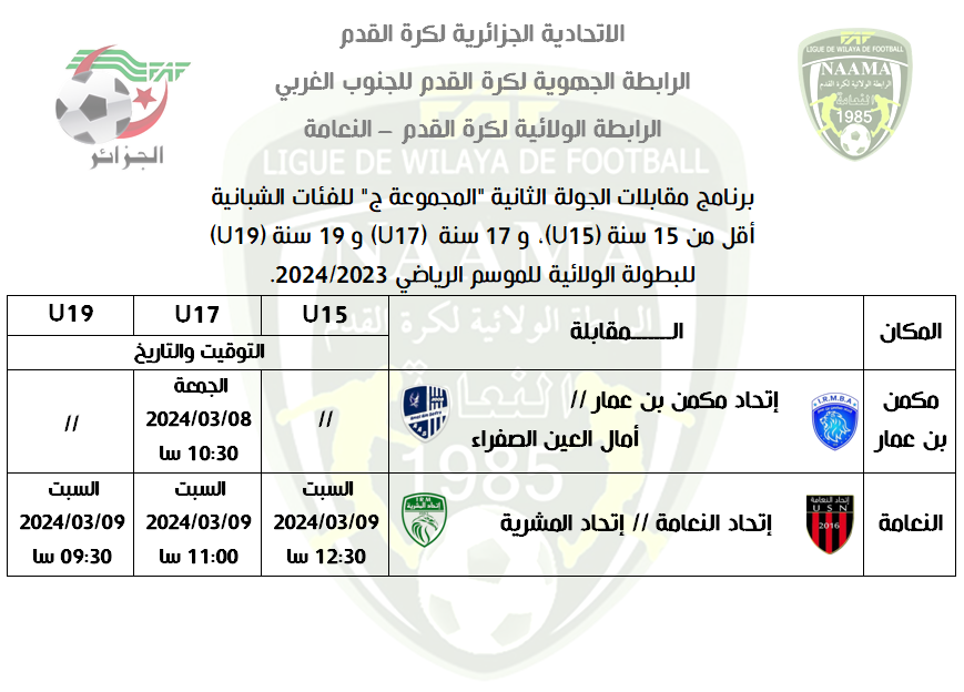 برنامج مقابلات بطولة الفئات الشبانية، الجولة الثانية “المجموعة ج” البرامج الرئيسية الشبانية 4 مارس 2024 by admin إليكم برنامج مقابلات الجولة الثانية “المجموعة ج” للفئات الشبانية أقل من 15 سنة (U15)، و 17 سنة (U17) و 19 سنة (U19) للبطولة الولائية للموسم الرياضي 2024/2023