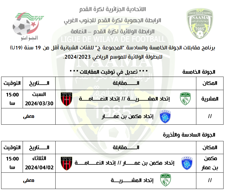 برنامج مقابلات بطولة الفئات الشبانية، الجولة الخامسة والسادسة “المجموعة ج” البرامج الرئيسية الشبانية 26 مارس 202428 مارس 2024 by admin إليكم برنامج مقابلات الجولة الخامسة والسادسة “المجموعة ج” للفئات الشبانية أقل من 19 سنة (U19) للبطولة الولائية للموسم الرياضي 2024/2023