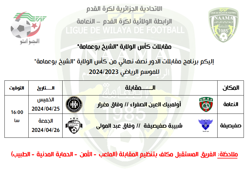 مقابلات نصف نهائي كأس الولاية “الشيخ بوعمامة” البرامج الرئيسية كأس الولاية 23 أبريل 2024 by admin إليكم برنامج مقابلات الدور نصف نهائي من كأس الولاية “الشيخ بوعمامة” للموسم الرياضي 2024/2023