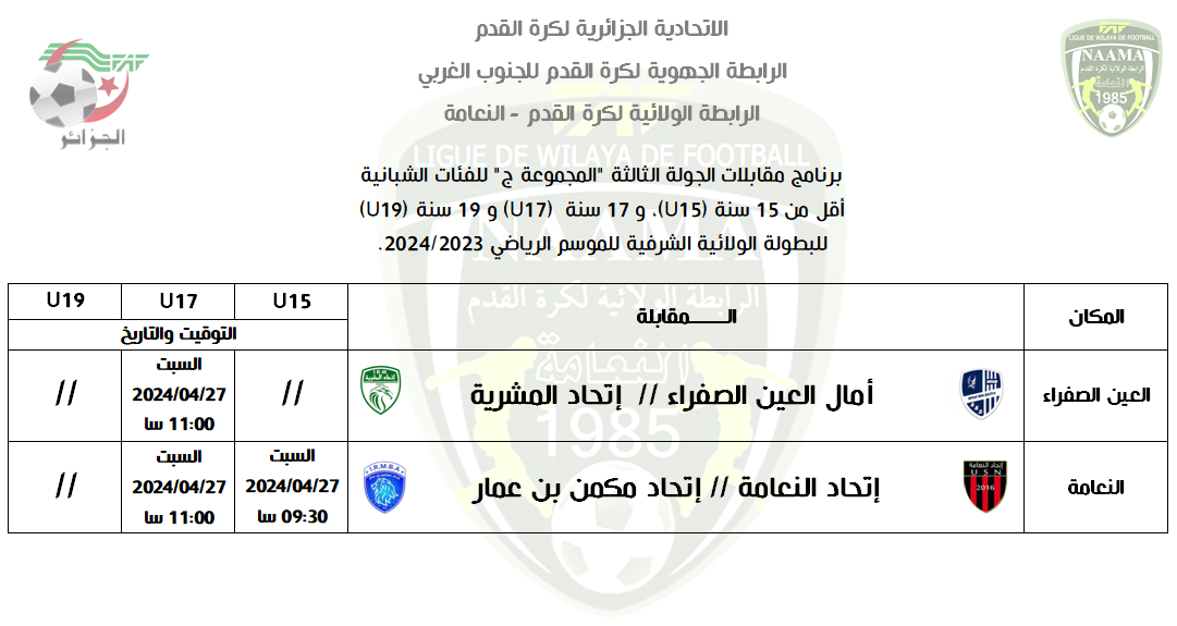 برنامج مقابلات بطولة الفئات الشبانية، الجولة الثالثة “المجموعة ج” البرامج الرئيسية الشبانية 21 أبريل 202430 أبريل 2024 by admin إليكم برنامج مقابلات الجولة الثالثة “المجموعة ج” للفئات الشبانية أقل من 15 سنة (U15)، و 17 سنة (U17) و 19 سنة (U19) للبطولة الولائية الشرفية للموسم الرياضي 2024/2023