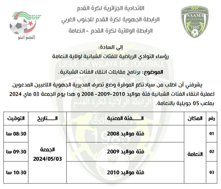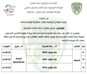 عملية الإنتقاء الجهوي للفئات الشبانية مواليد 22010-2009-2008 الرئيسية الشبانية اللجنة التقنية 3 مايو 20246 مايو 2024 by admin صور صبيحة هذا اليوم من عملية الإنتقاء الجهوي للفئات الشبانية (مواليد سنوات 2010-2009-2008) تحت إشراف الرابطة الولائية لكرة القدم وهذا بملعب 05 جويلية النعامة، بالتوفيق للجميع .