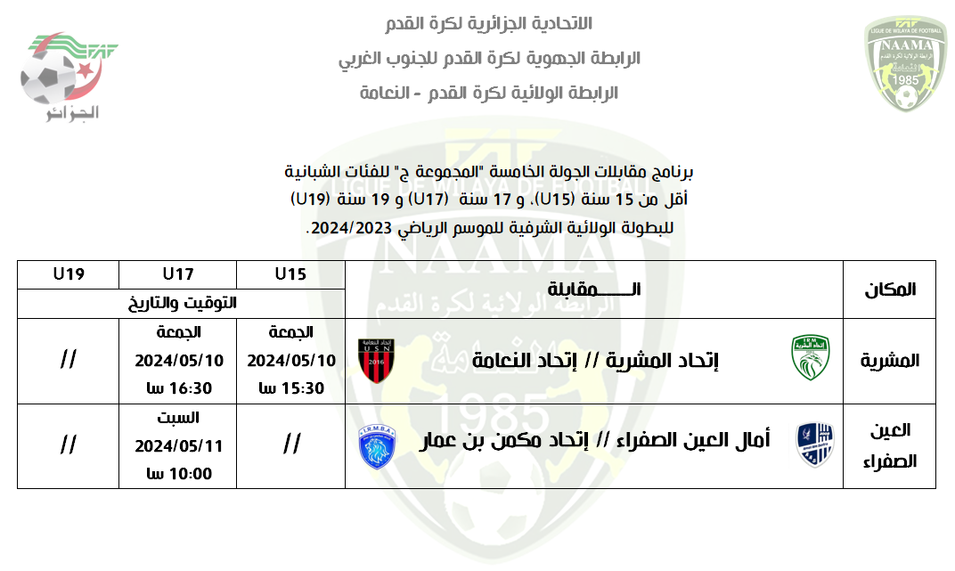 برنامج مقابلات بطولة الفئات الشبانية، الجولة الخامسة “المجموعة ج” البرامج الرئيسية الشبانية 8 مايو 20249 مايو 2024 by admin إليكم برنامج مقابلات الجولة الخامسة “المجموعة ج” للفئات الشبانية أقل من 15 سنة (U15)، و 17 سنة (U17) و 19 سنة (U19) للبطولة الولائية الشرفية للموسم الرياضي 2024/2023