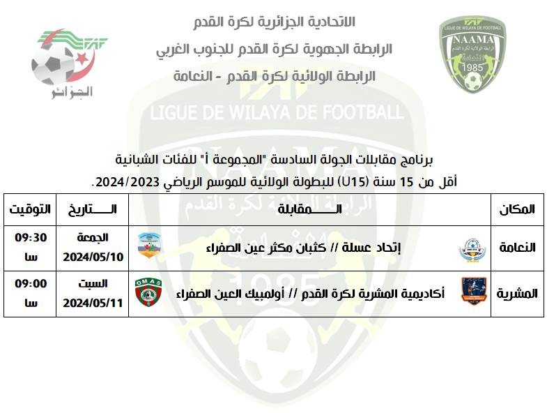 برنامج مقابلات بطولة الفئات الشبانية، الجولة السادسة “المجموعة أ” البرامج الرئيسية الشبانية 8 مايو 20249 مايو 2024 by admin إليكم برنامج مقابلات الجولة الخامسة “المجموعة أ” للفئات الشبانية أقل من 15 سنة (U15) للبطولة الولائية للموسم الرياضي 2024/2023