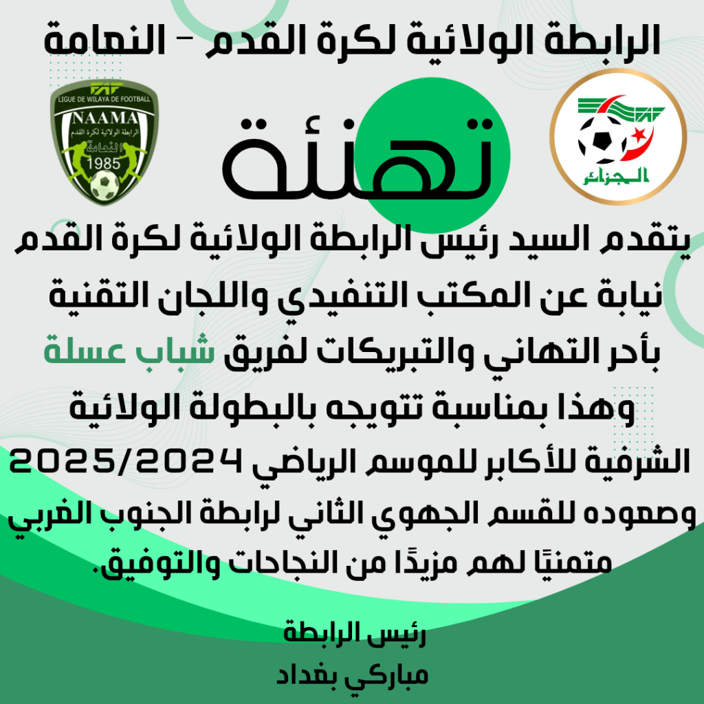 يتقدم السيد رئيس الرابطة الولائية لكرة القدم نيابة عن المكتب التنفيدي واللجان التقنية بأحر التهاني والتبريكات لفريق شباب عسلة وهذا بمناسبة تتويجه بالبطولة الولائية الشرفية للأكابر للموسم الرياضي 2025/2024 وصعوده للقسم الجهوي الثاني لرابطة الجنوب الغربي متمنيًا لهم مزيدًا من النجاحات والتوفيق.