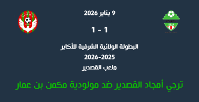 ففي اللقاء الأول الذي احتضنه ملعب القصدير يوم أمس الجمعة 9 جانفي 2026، انتهت المواجهة التي جمعت بين ترجي أمجاد القصدير ومولودية مكمن بن عمار بنتيجة التعادل الإيجابي (1-1)، في مباراة متوازنة تبادل فيها الفريقان السيطرة وصناعة الفرص، لينتهي اللقاء بتقاسم النقاط.