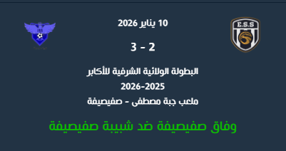 أما المقابلة الثانية، التي جرت هذا اليوم السبت 10 جانفي 2026 على أرضية ملعب جبة مصطفى بصفيصيفة، فقد حملت طابع الداربي المحلي باعتبار أن الفريقين ينتميان إلى مدينة صفيصيفة، حيث جمعت بين وفاق صفيصيفة وشبيبة صفيصيفة. وتميزت المباراة بالإثارة والندية إلى غاية الدقائق الأخيرة، وتمكنت شبيبة صفيصيفة من تحقيق فوز ثمين بنتيجة 3-2 في لقاء حماسي نال استحسان الجماهير الحاضرة.