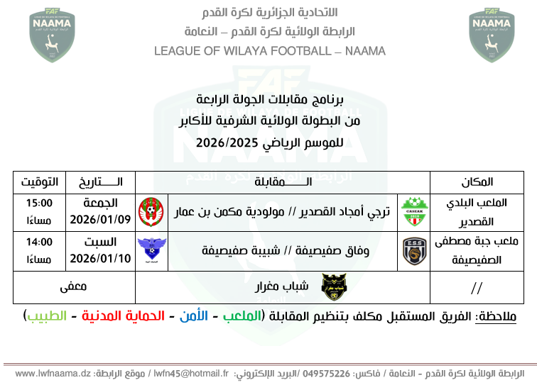 عرفت هذه الجولة من منافسات البطولة الولائية الشرفية للأكابر (موسم 2025–2026)، التي جرت يومي 9 و10 جانفي 2026، مباريات قوية اتسمت بالندية والحماس، وعكست تقارب المستويات بين الفرق المتنافسة.
