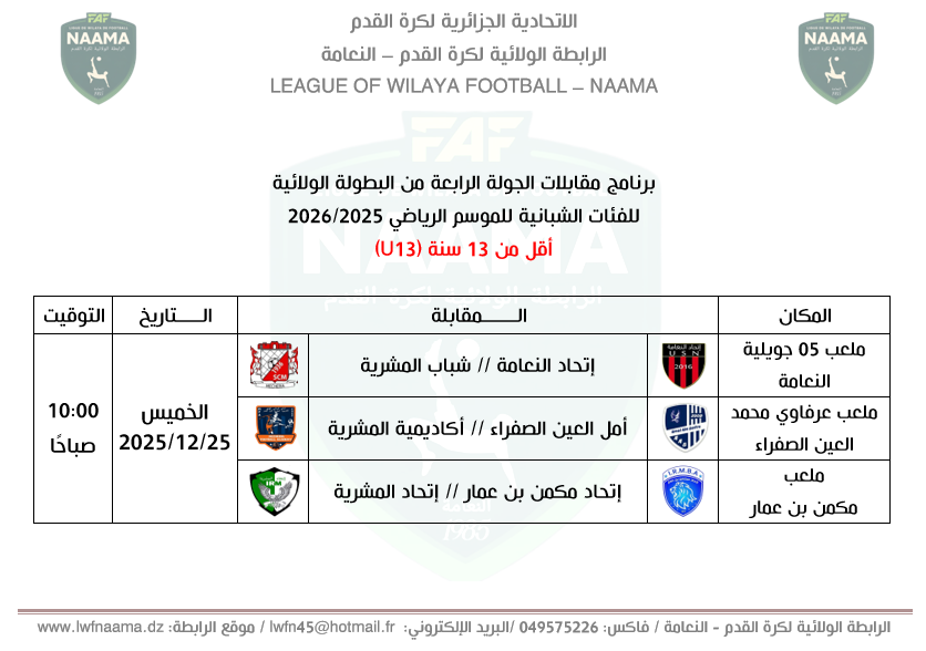 برنامج مقابلات الجولة الرابعة من البطولة الولائية للفئات الشبانية للموسم الرياضي 2026/2025 أقل من 13 سنة (U13)