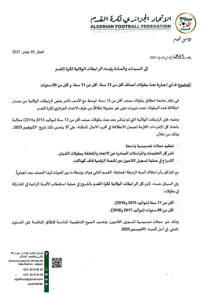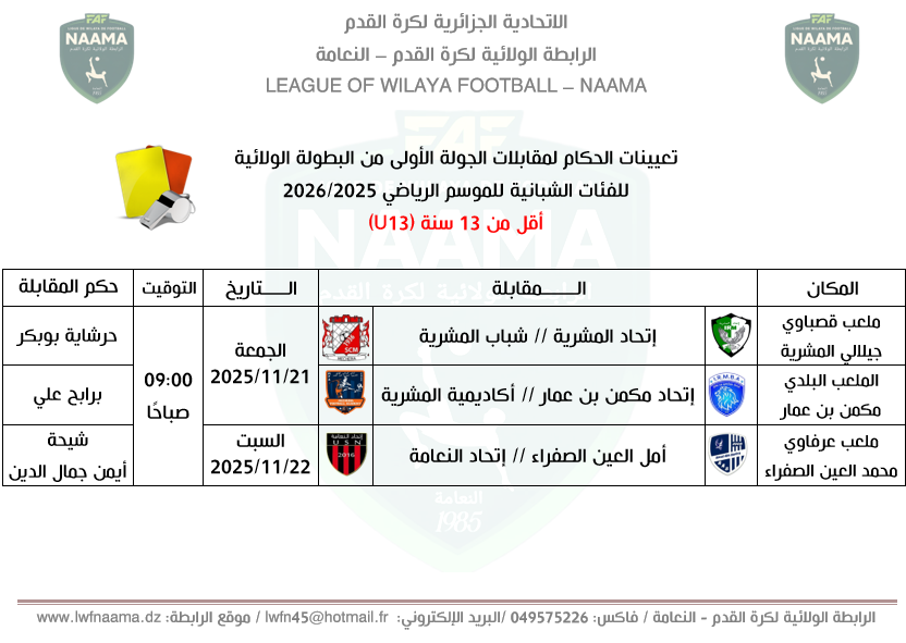 شهد ملعب قصباوي جيلالي بالمشرية صبيحة اليوم الجمعة 21 نوفمبر 2025، انطلاق منافسات البطولة الولائية للفئات الشبانية لصنف أقل من 13 سنة (U13) للموسم الرياضي 2025–2026، وسط أجواء رياضية مميزة وحضور رسمي ضم كلًا من السيد مباركي_بغداد رئيس الرابطة الولائية لكرة القدم بالنعامة، والسيد شلالي_أحمد الأمين العام للرابطة، والسيد مولواد_أحمد رئيس لجنة التحكيم، الذين أكدوا في كلماتهم تشجيع المواهب الشبانية وحرصهم على توفير أجواء تنافسية سليمة لتطوير كرة القدم القاعدية.