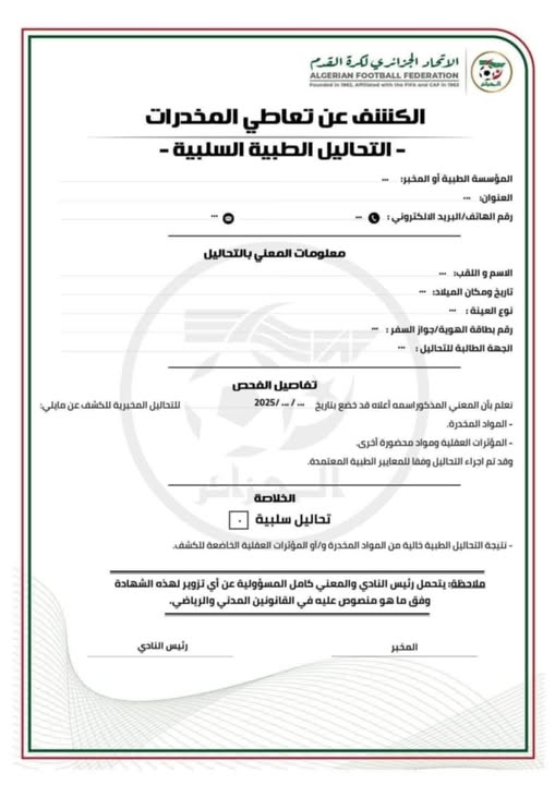 جميع الأصناف خاضعة لعمليات كشف فجائية من اللجنة الطبية للاتحاد.