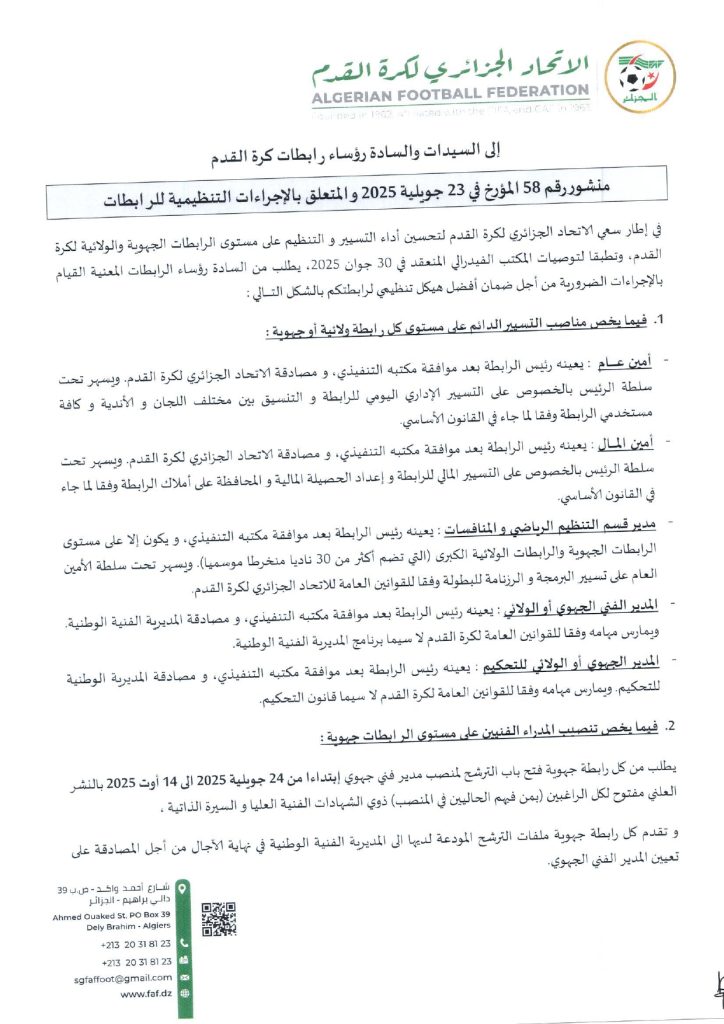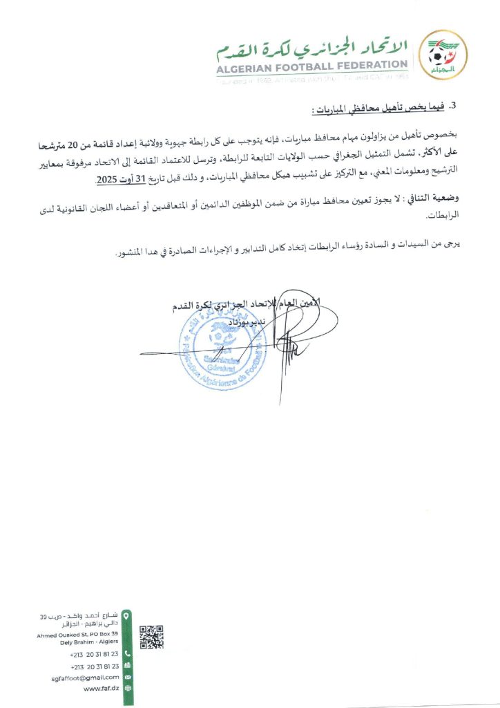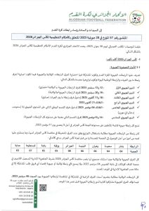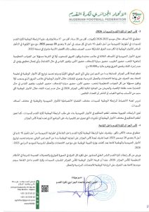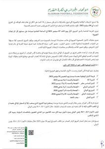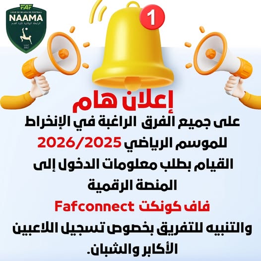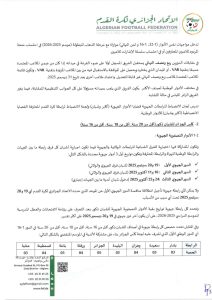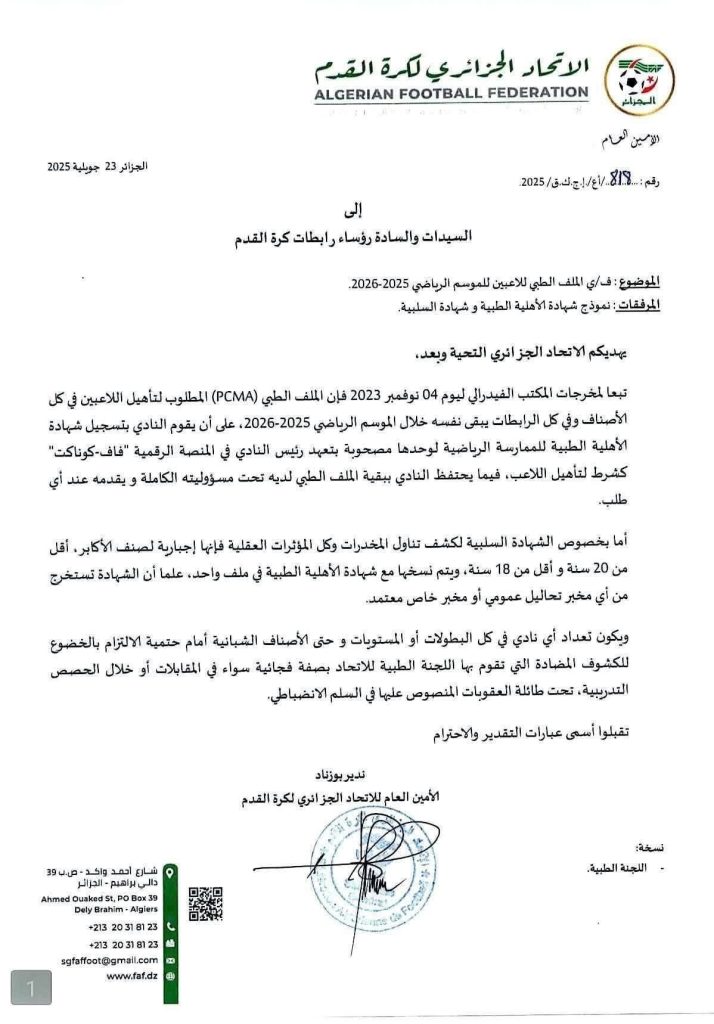 تبعًا لتعليمات المكتب الفيدرالي للاتحاد الجزائري لكرة القدم بتاريخ 04 نوفمبر 2023، تعلم الرابطة الولائية لكرة القدم – النعامة، جميع الأندية أن الملف الطبي (PCMA) المطلوب لتأهيل اللاعبين في جميع الأصناف يبقى نفسه.