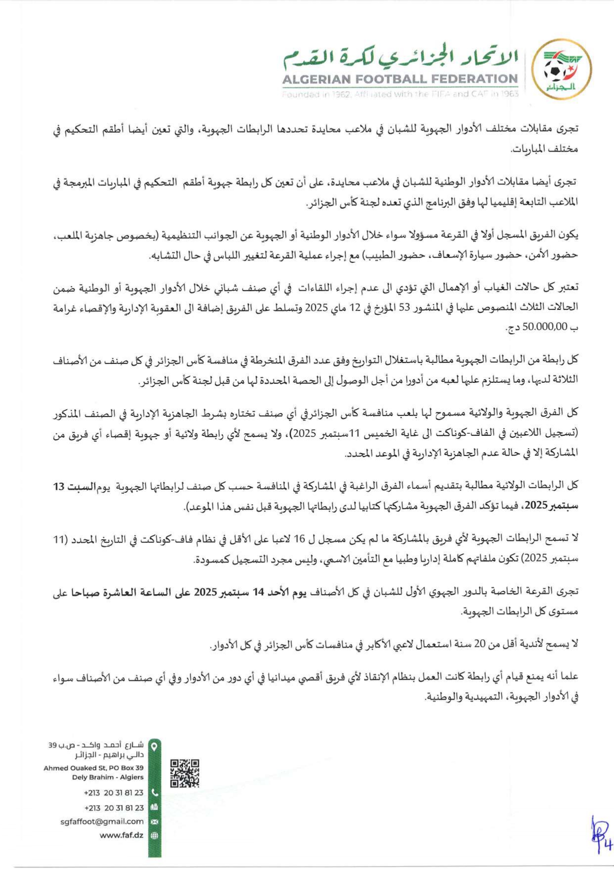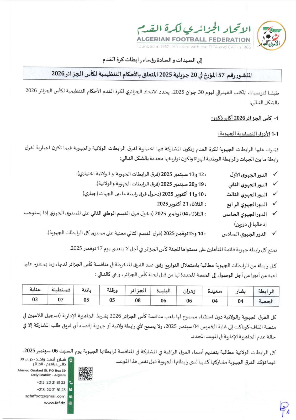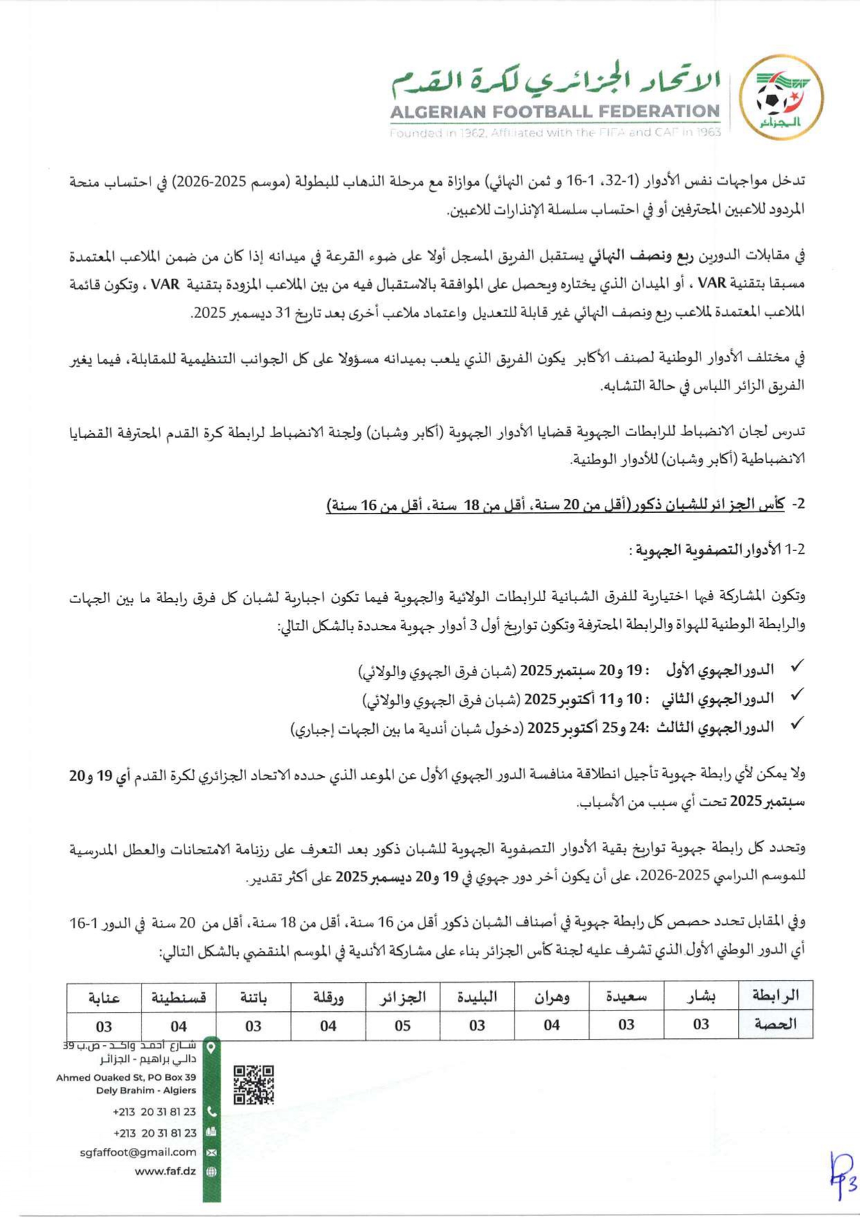 تبعًا لتعليمات المكتب الفيدرالي للاتحاد الجزائري لكرة القدم بتاريخ 04 نوفمبر 2023، تعلم الرابطة الولائية لكرة القدم – النعامة، جميع الأندية أن الملف الطبي (PCMA) المطلوب لتأهيل اللاعبين في جميع الأصناف يبقى نفسه.