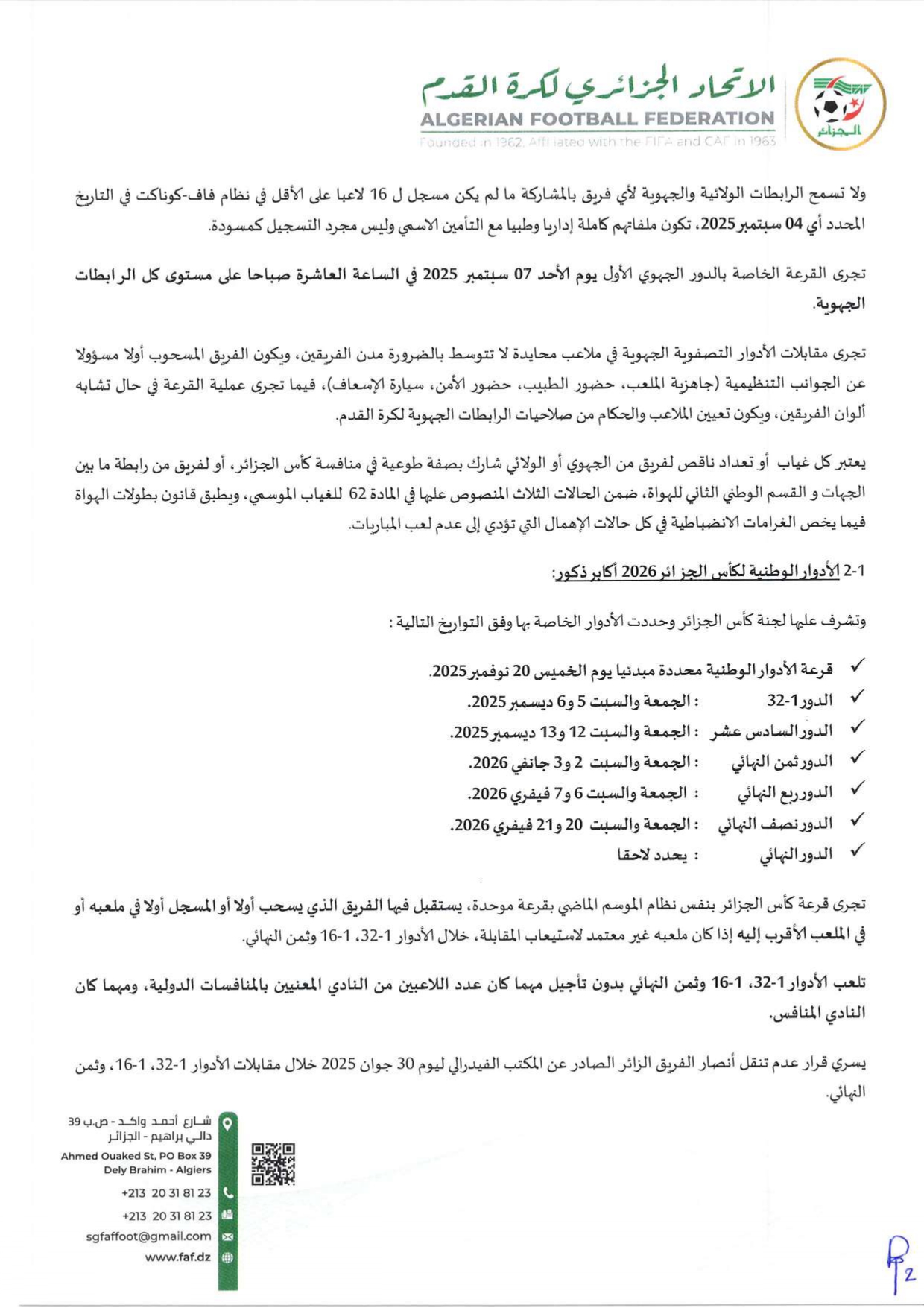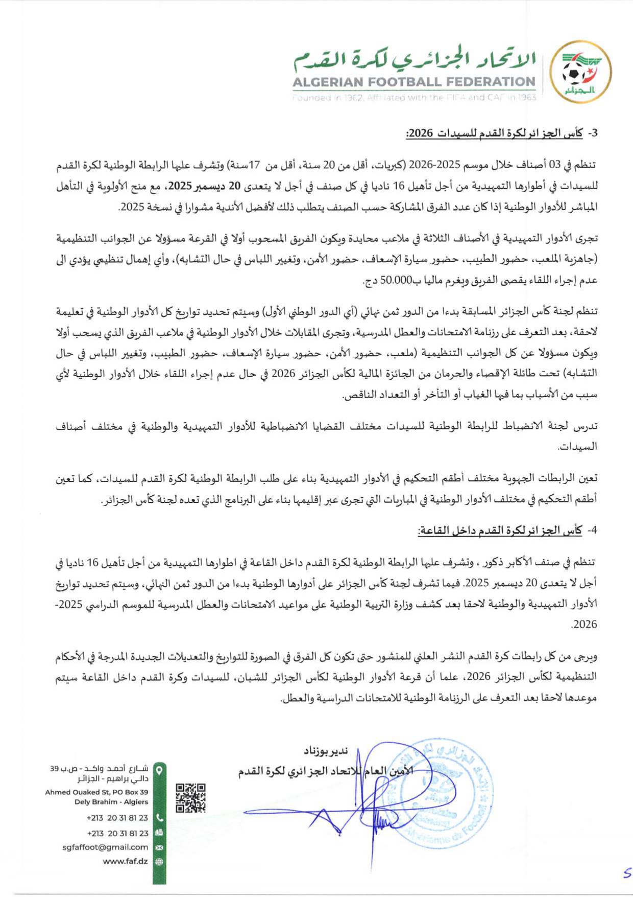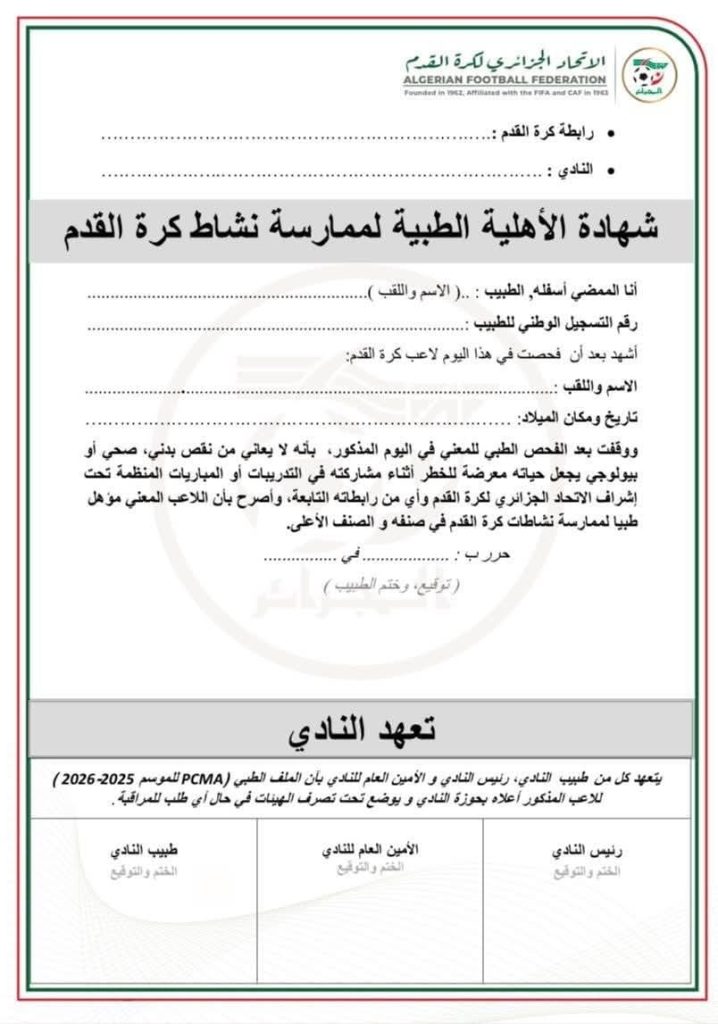 تسجيل شهادة الأهلية الطبية فقط + تعهد رئيس النادي على منصة “فاف-كوناكت”.