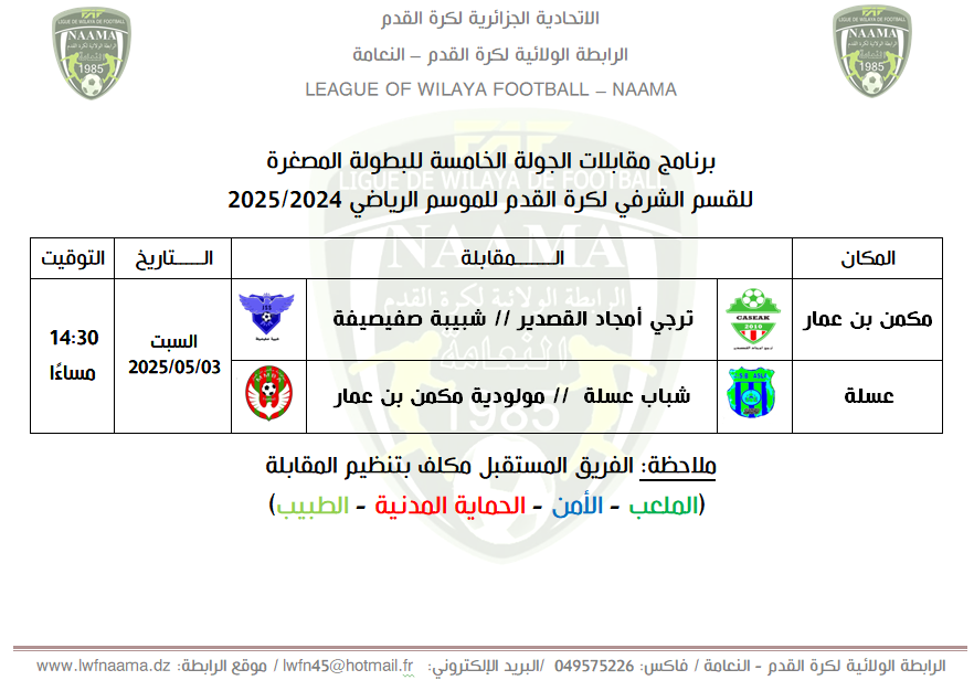 29 أبريل 2025 by admin برنامج مقابلات الجولة الخامسة للبطولة المصغرة للقسم الشرفي لكرة القدم برنامج مقابلات الجولة الخامسة للبطولة المصغرة للقسم الشرفي لكرة القدم للموسم الرياضي 2025/2024