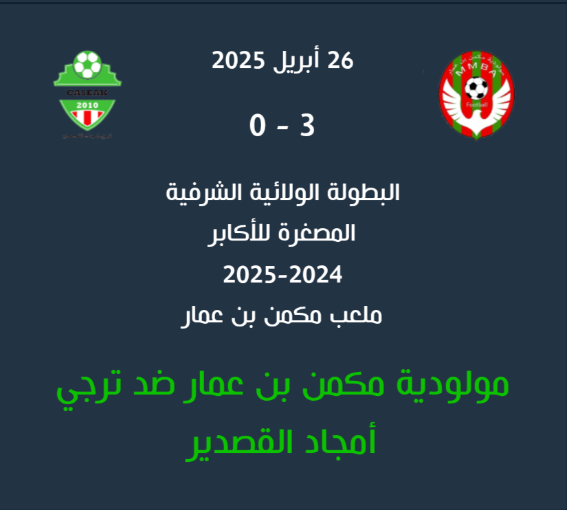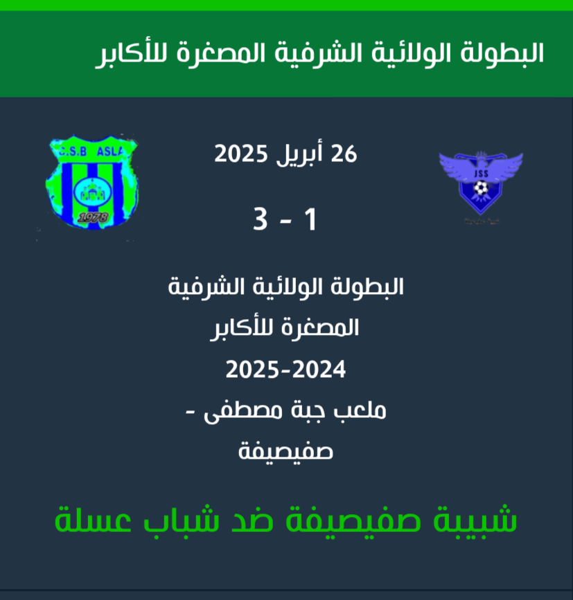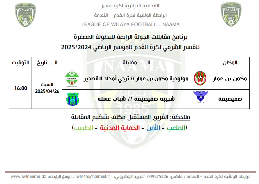 إليكم نتائج مقابلات الجولة الرابعة للبطولة الولائية الشرفية المصغرة للأكابر والتي جرت هذا اليوم السبت 26 أفريل 2025 إبتداءًا من الساعة الرابعة 16:00 مساءًا
