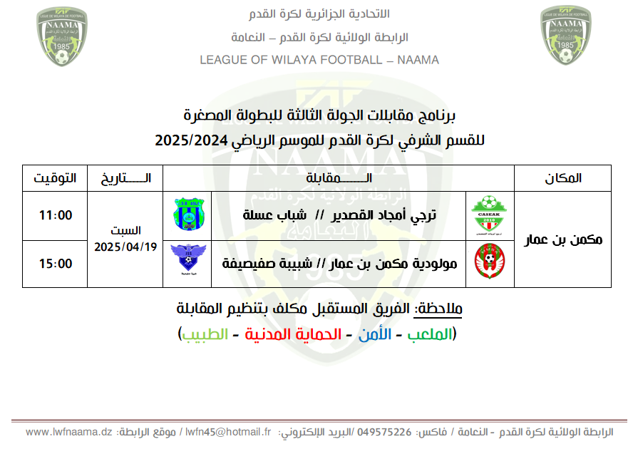 برنامج مقابلات الجولة الثالثة للبطولة المصغرة للقسم الشرفي لكرة القدم للموسم الرياضي 2025/2024
