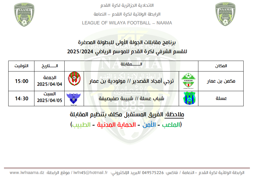 1 أبريل 20251 أبريل 2025 by admin برنامج مقابلات الدور النصف نهائي كأس الولاية “الشيخ بوعمامة” للفئات الشبانية برنامج مقابلات الدور النصف نهائي كأس الولاية “الشيخ بوعمامة” للفئات الشبانية للموسم الرياضي 2025/2024 صنفي أقل من 15 و 17 سنة