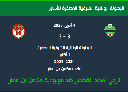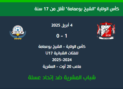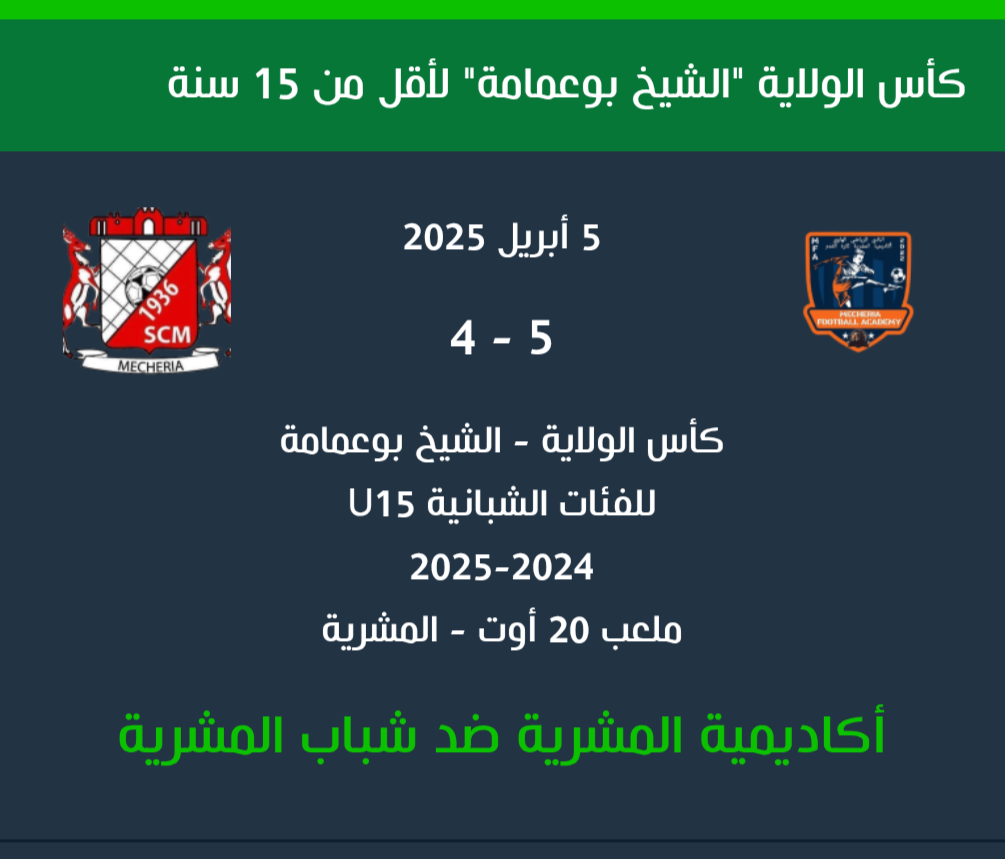5 أبريل 202515 أبريل 2025 by admin نتائج مقابلات هذا اليوم – السبت 05 أفريل 2025 نتائج مقابلات هذا اليوم – السبت 05 أفريل 2025 – بعد نهاية مقابلة كأس الرابطة لأقل من 15 سنة بالتعادل (1-1) تم الإحتكام لضربات الجزاء التي أفضت لفوز أكاديمية المشرية على ضيفه شباب المشرية (5-4).