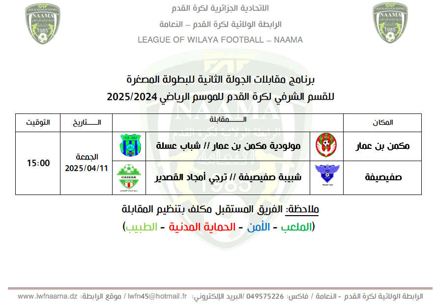 7 أبريل 202515 أبريل 2025 by admin برنامج مقابلات الجولة الثانية للبطولة المصغرة للقسم الشرفي لكرة القدم برنامج مقابلات الجولة الثانية للبطولة المصغرة للقسم الشرفي لكرة القدم للموسم الرياضي 2025/2024