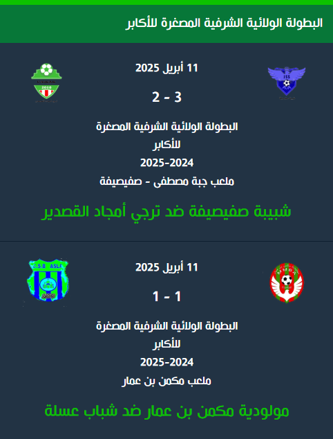 11 أبريل 202516 أبريل 2025 by admin نتائج مقابلات هذا اليوم – الجمعة 11 أفريل 2025 نتائج مقابلات الجولة الثانية من البطولة الولائية الشرفية المصغرة للأكابر
