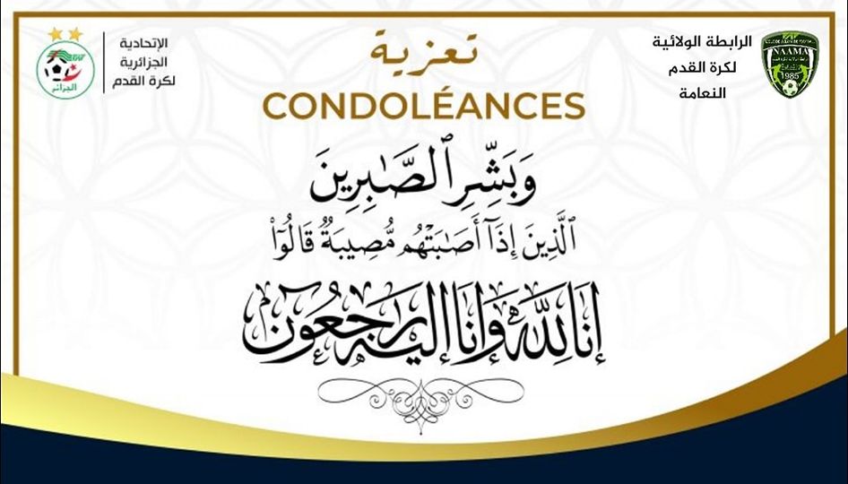 وبهذا المصاب الجلل، يتقدم رئيس الرابطة باسمه وباسم أعضاء مكتبه التنفيدي إلى عائلة الفقيد وكل أسرة كرة القدم الجزائرية، بخالص التعازي وأسمى عبارات المواساة، سائلين المولى عز وجل، أن يتغمد فقيدهم بواسع رحمته، ويسكنه فسيح جناته ويلهم أهله وذويه جميل الصبر و السلوان.