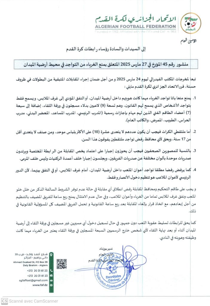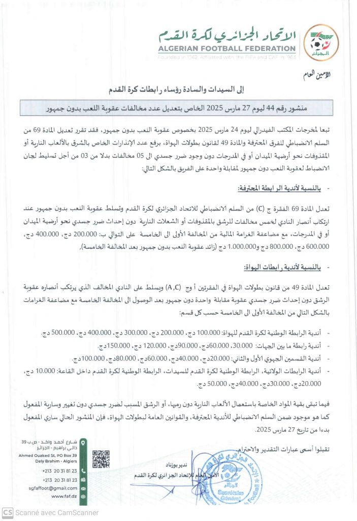 منشور رقم 44 ليوم 27 مارس 2025 الخاص بتعديل عدد مخالفات عقوبة اللعب بدون جمهور.
