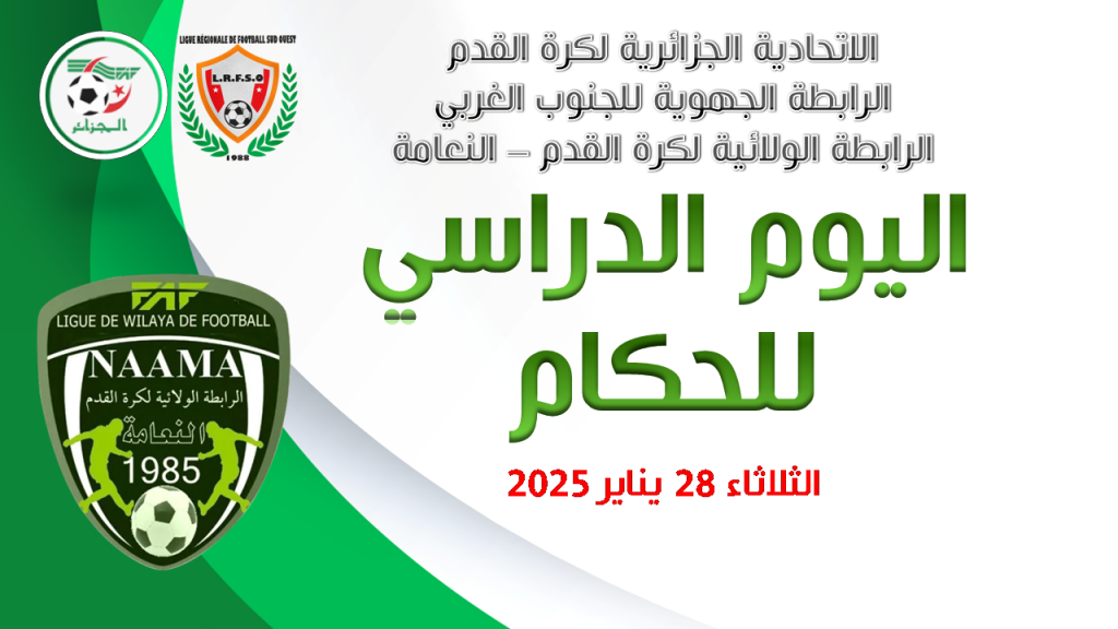 إنطلاق اليوم التكويني للحكام الجهويين لرابطة الجنوب الغربي (ولاية النعامة) بمقر الرابطة الولائية بملعب 20 أوت وبحضور السادة #لغزيل_ناجم رئيس لجنة التحكيم الجهوية و #حراز_ميلود مكون وطني للحكام الجهويين و #دريويلتي_جلول أمين اللجنة الجهوية التحكيم.