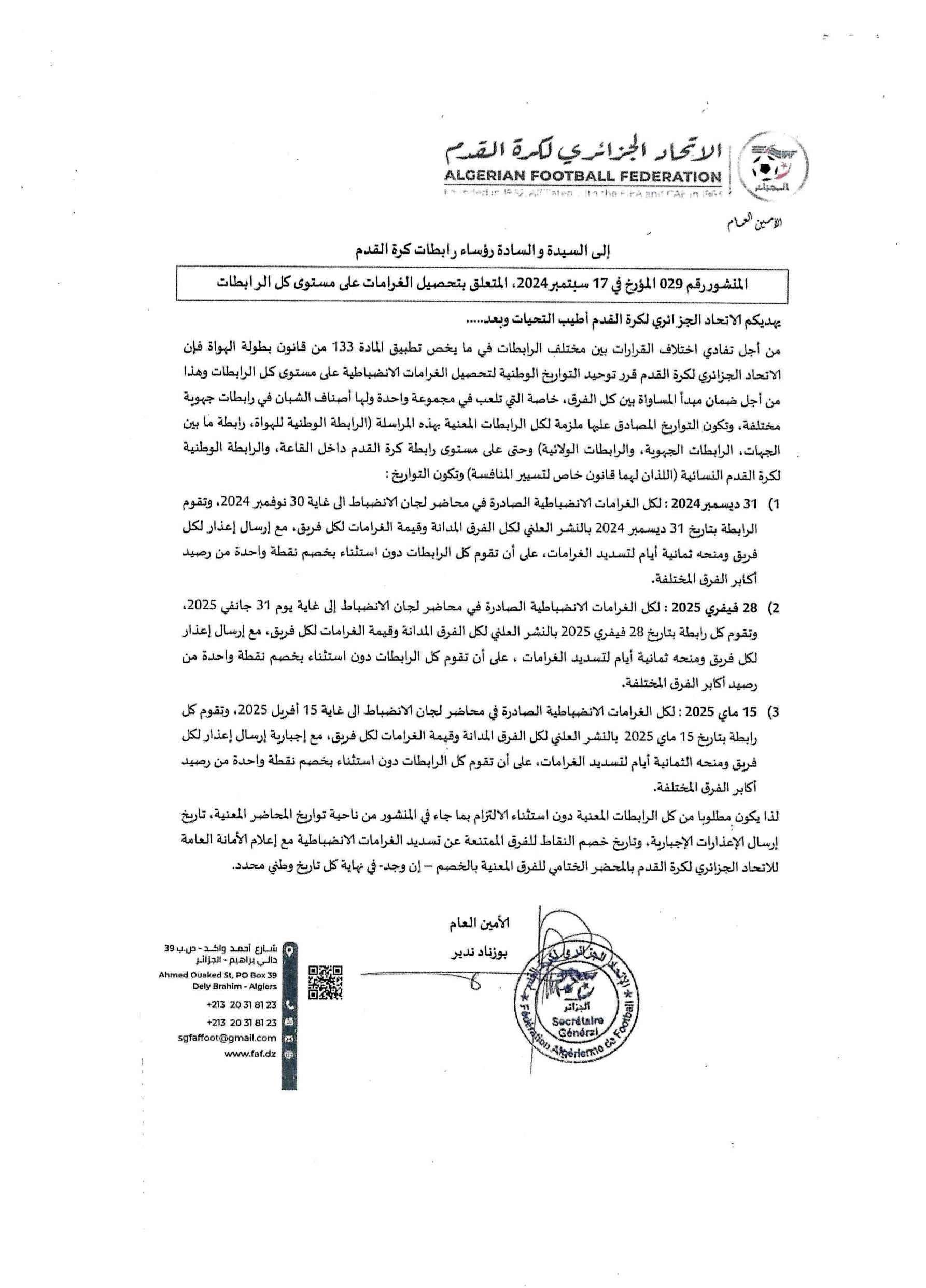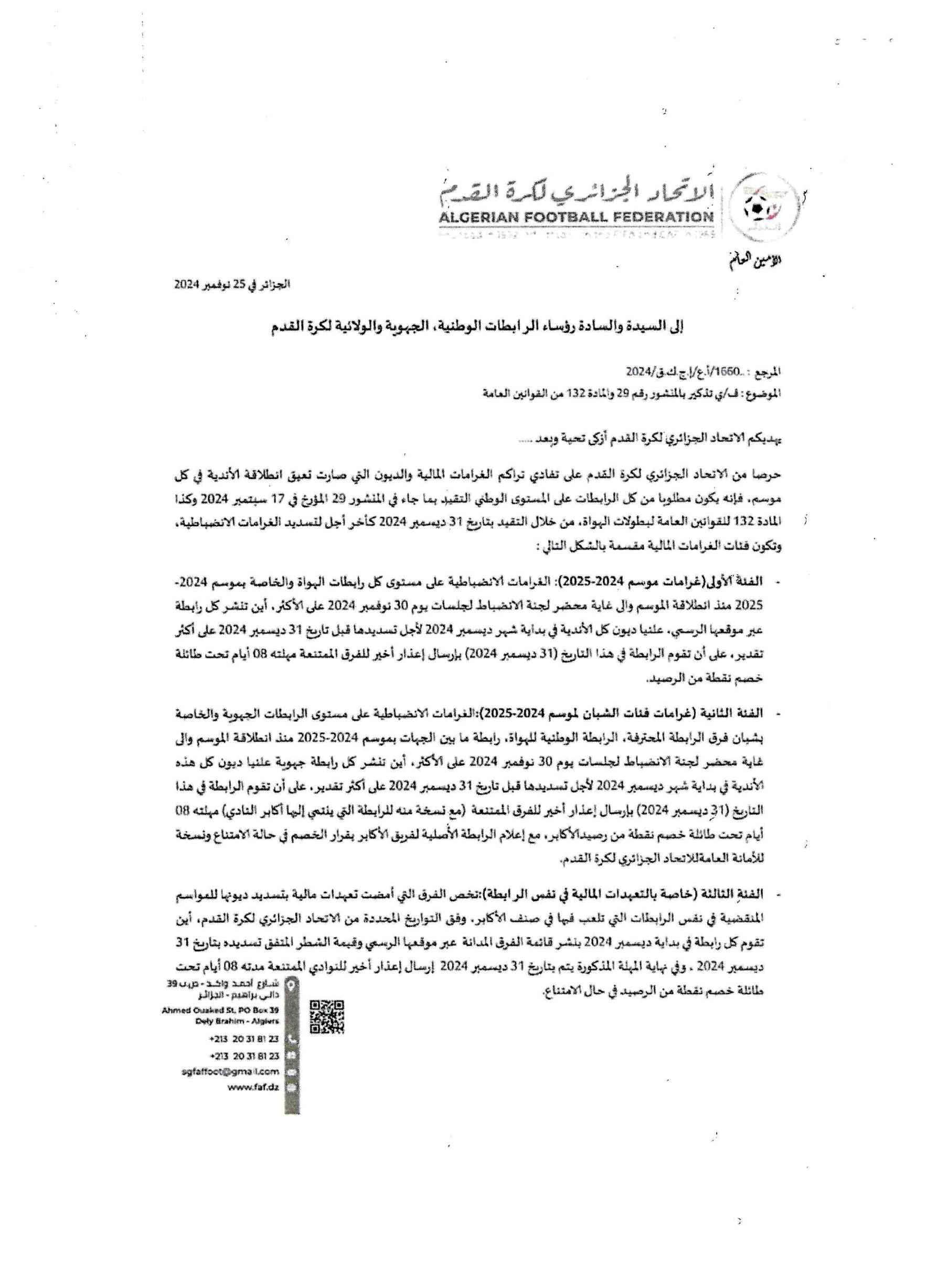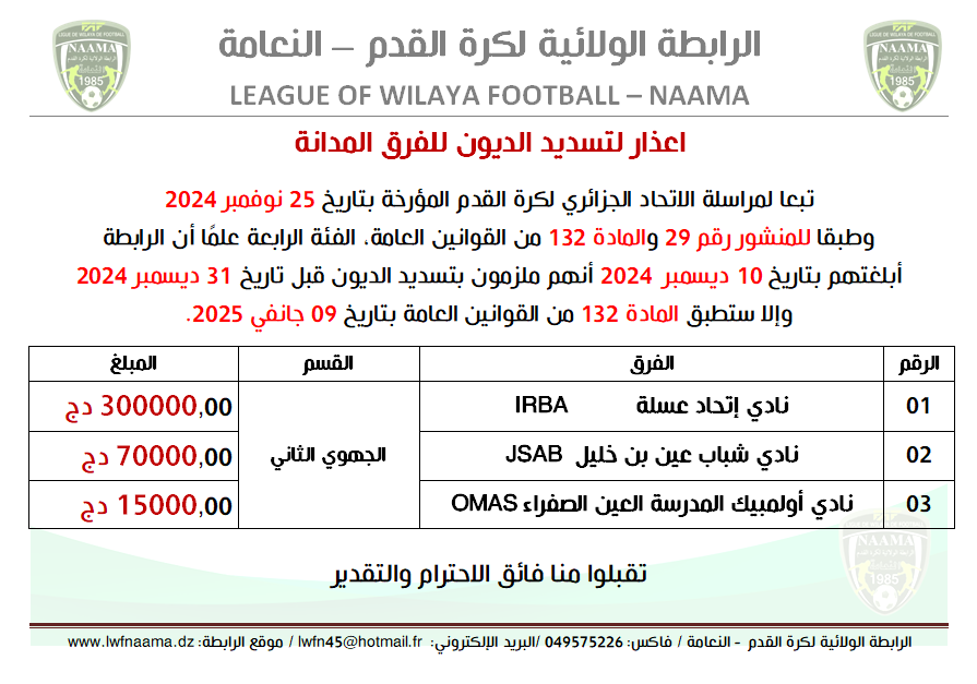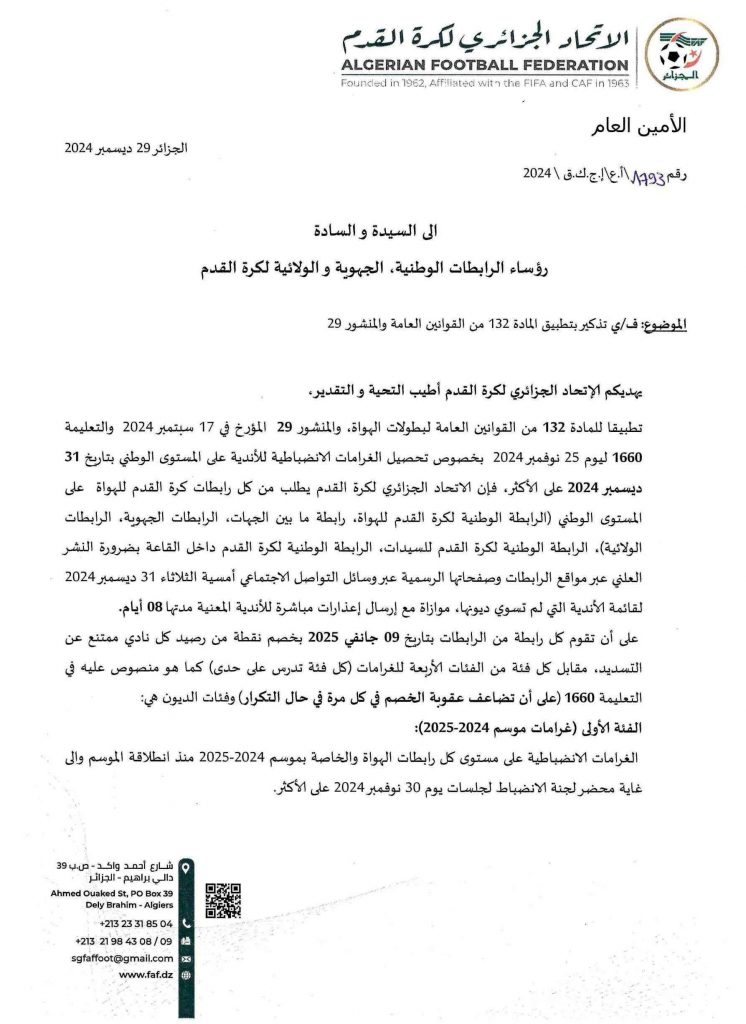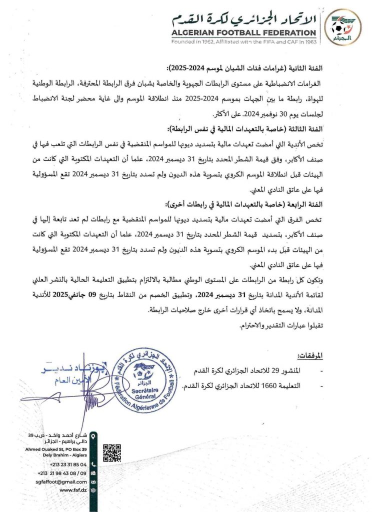 تبعا لمراسلة الاتحاد الجزائري لكرة القدم المؤرخة بتاريخ 25 نوفمبر 2024 وطبقا للمنشور رقم 29 والمادة 132 من القوانين العامة، الفئة الرابعة علمًا أن الرابطة أبلغتهم بتاريخ 10 ديسمبر 2024 أنهم ملزمون بتسديد الديون قبل تاريخ 31 ديسمبر 2024 وإلا ستطبق المادة 132 من القوانين العامة بتاريخ 09 جانفي 2025.