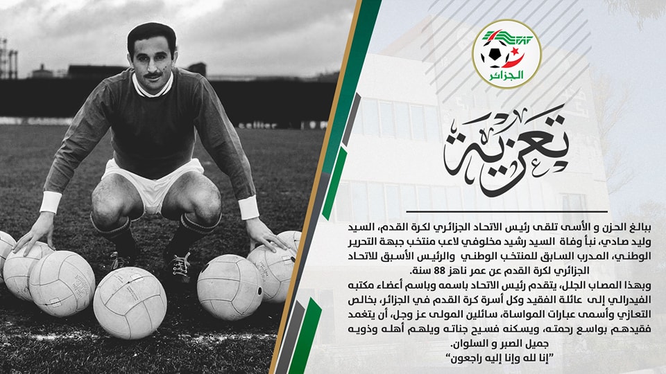 بهذه المناسبة الأليمة، يعرب رئيس الاتحاد الجزائري لكرة القدم مجددا عن خالص تعازيه ومواساته لعائلة الفقيد.