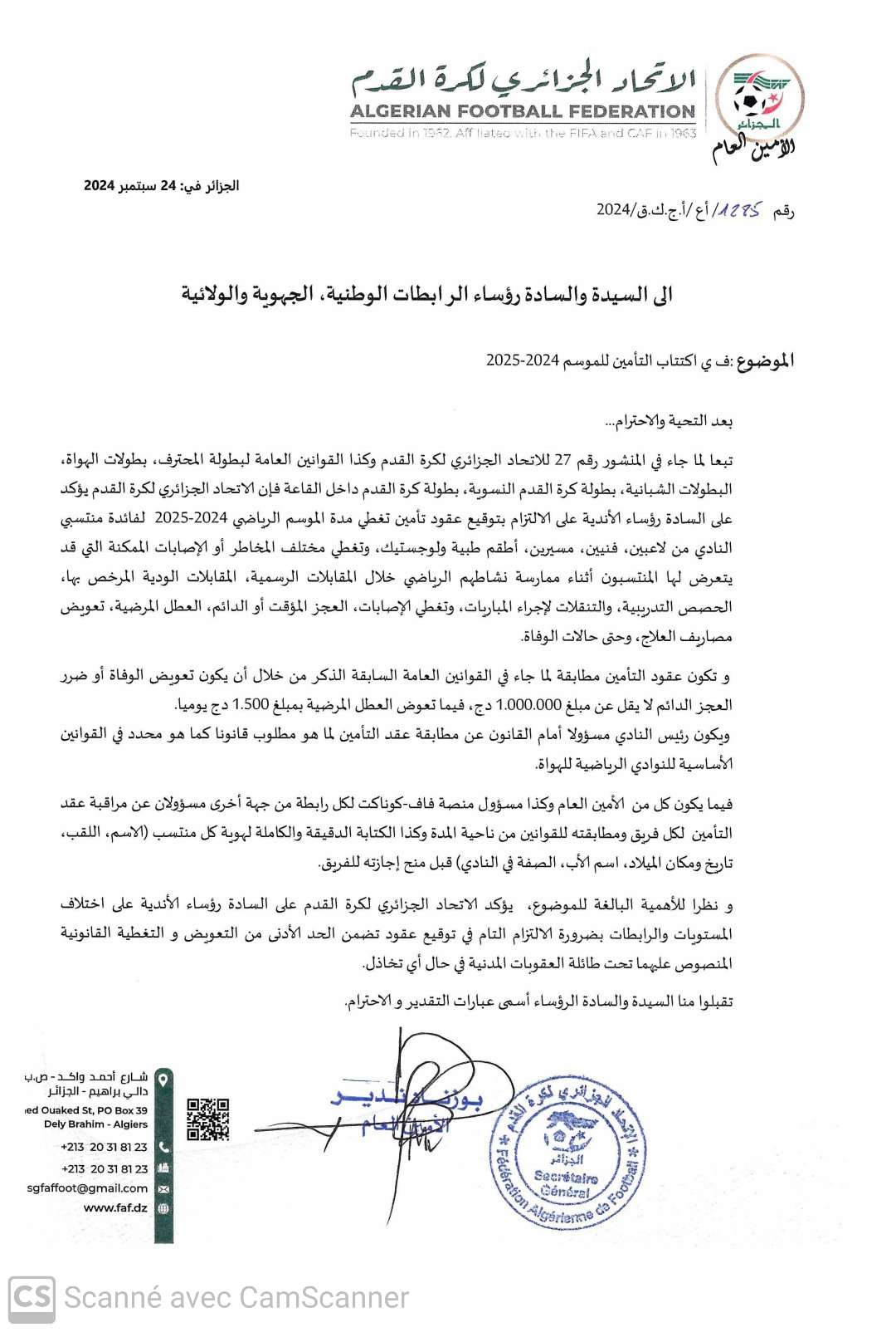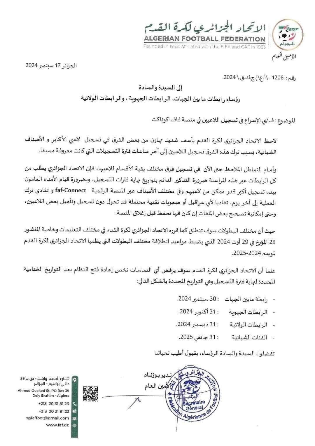 دعا الاتحاد الجزائري لكرة القدم كافة الأندية الرياضية عبر مختلف الأقسام إلى تسريع عملية تسجيل لاعبيها على منصة “فاف كونيكت” (faf-Connect).