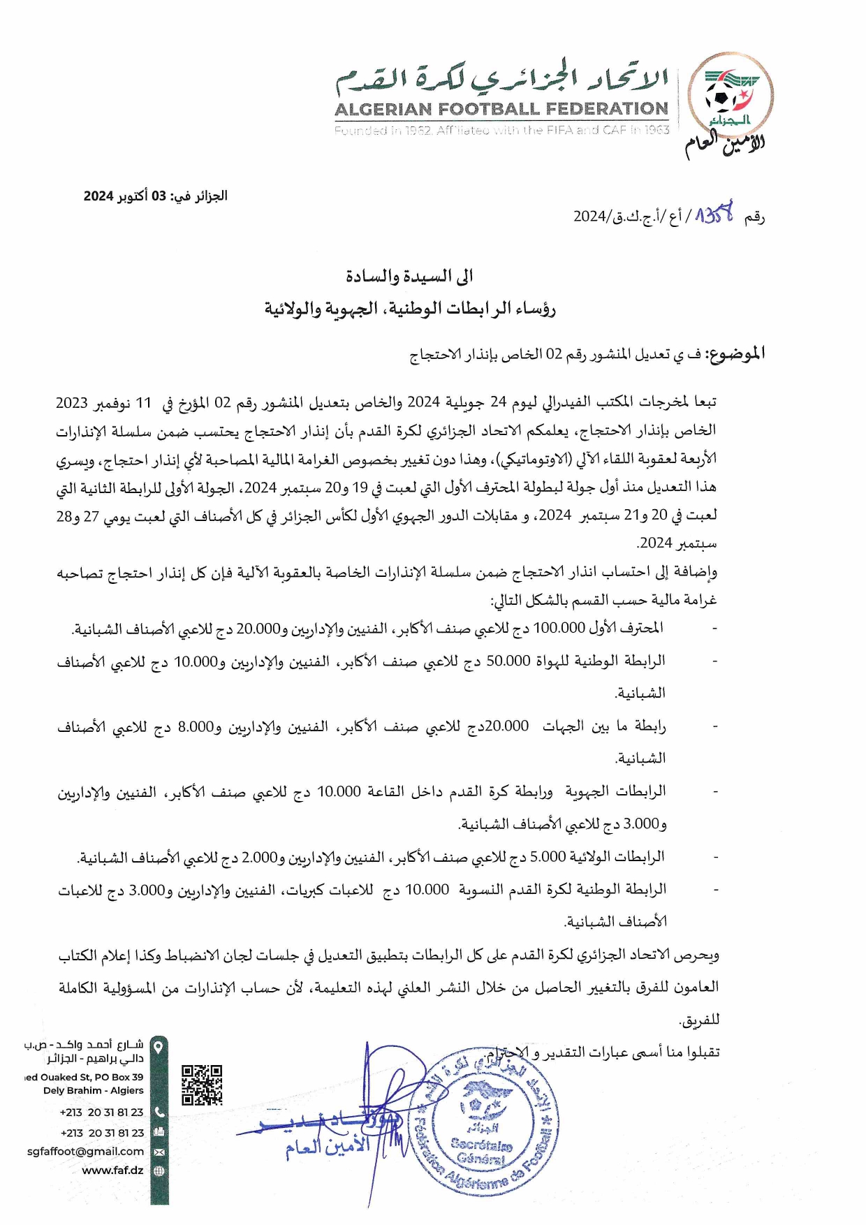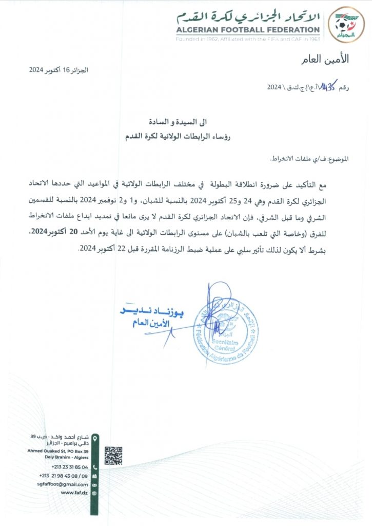 تمديد تاريخ ايداع ملفات الانخراط على مستوى ارضية فاف كونكت (FAFCONNECT) إلى غاية يوم الأحد 20 أكتوبر 2024، مع الابقاء على تواريخ انطلاق البطولة، كما كانت مبرمجة سابقًا بالنسبة للفئات الشبانية 25 اكتوبر 2024 وللأكابر 01 نوفمبر 2024.