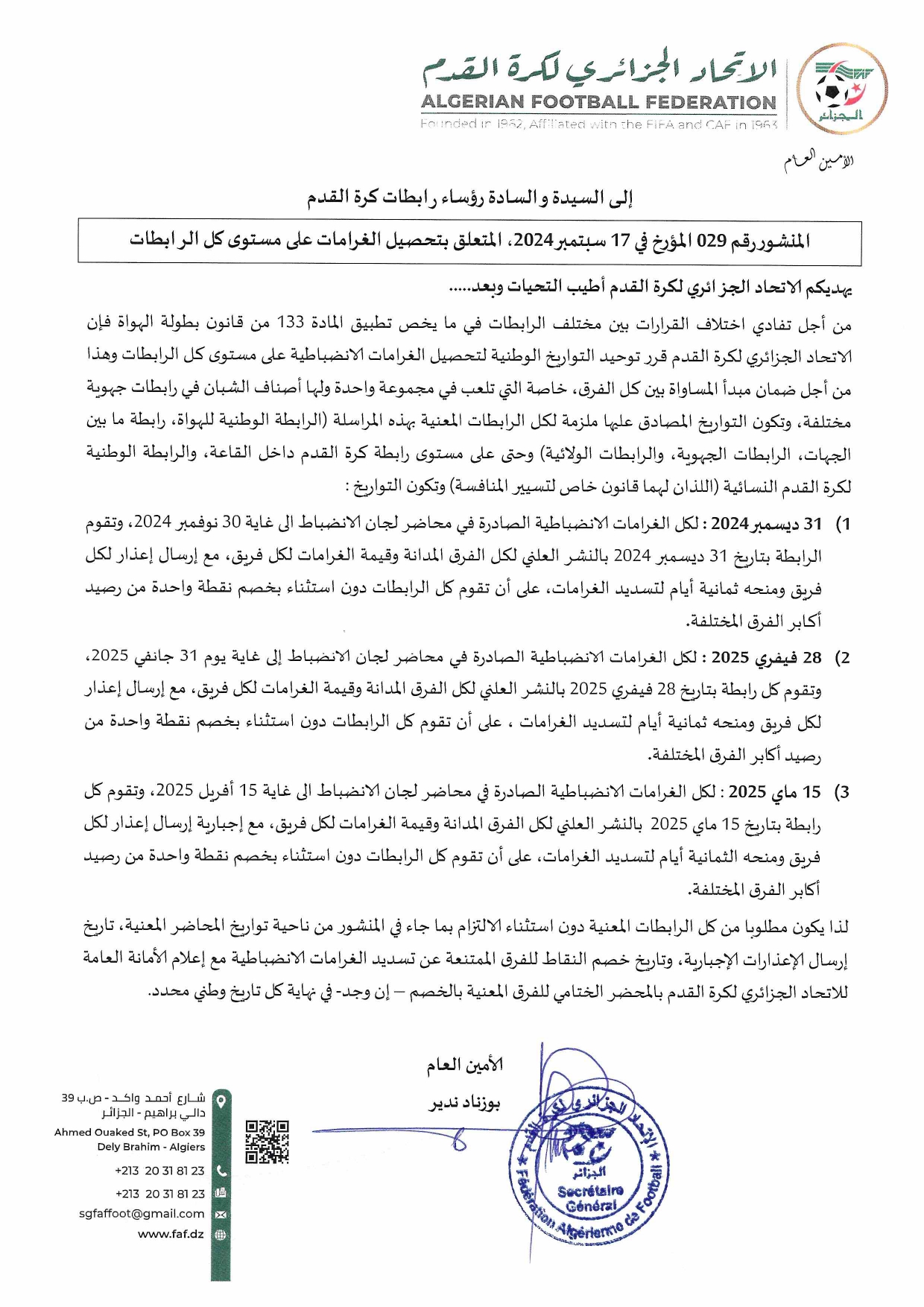المنشور رقم 028 المتعلق بمواعيد انطلاق البطولات، حقوق الانخراط والغرامات، حيت حدد تاريخ 01 نوفمبر 2024 بالنسبة للبطولات الولائية.