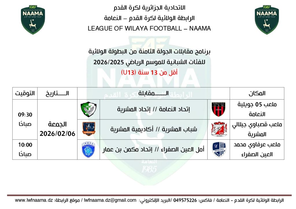 شهدت منافسات البطولة الولائية للفئات الشبانية لأقل من 13 سنة (U13)، يوم 6 فيفري 2026، إجراء جولة جديدة حملت في طياتها نتائج متباينة، بين تأكيد الهيمنة، وتعادلات عكست تقارب المستويات، في موسم يتسم بالإثارة والتنافس.