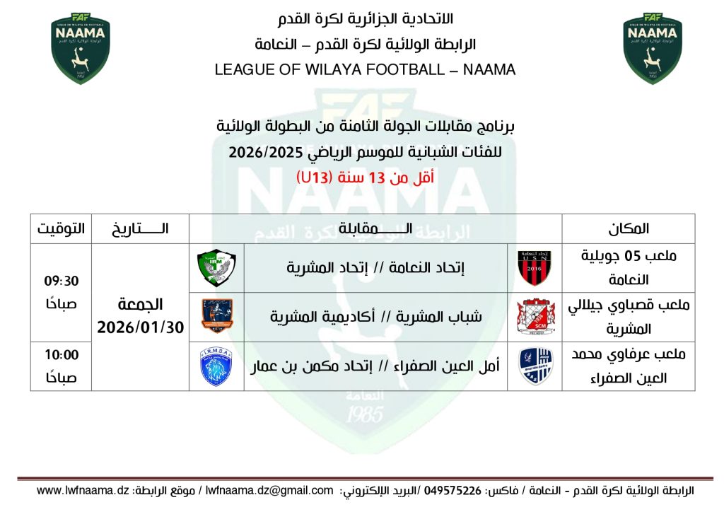 برنامج مقابلات الجولة الثامنة من البطولة الولائية للفئات الشبانية للموسم الرياضي 2026/2025